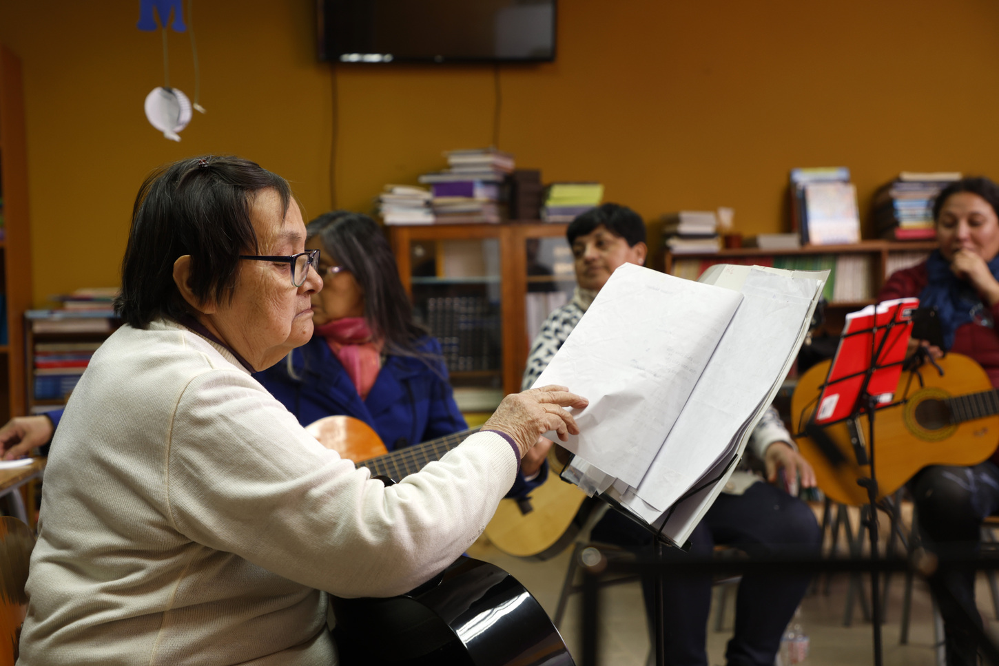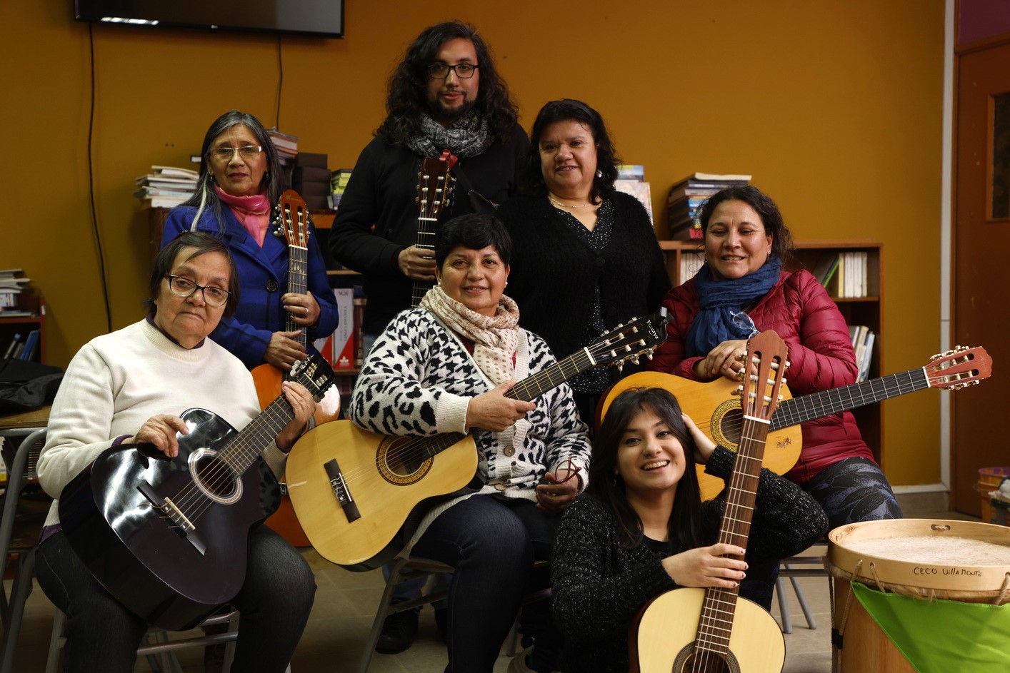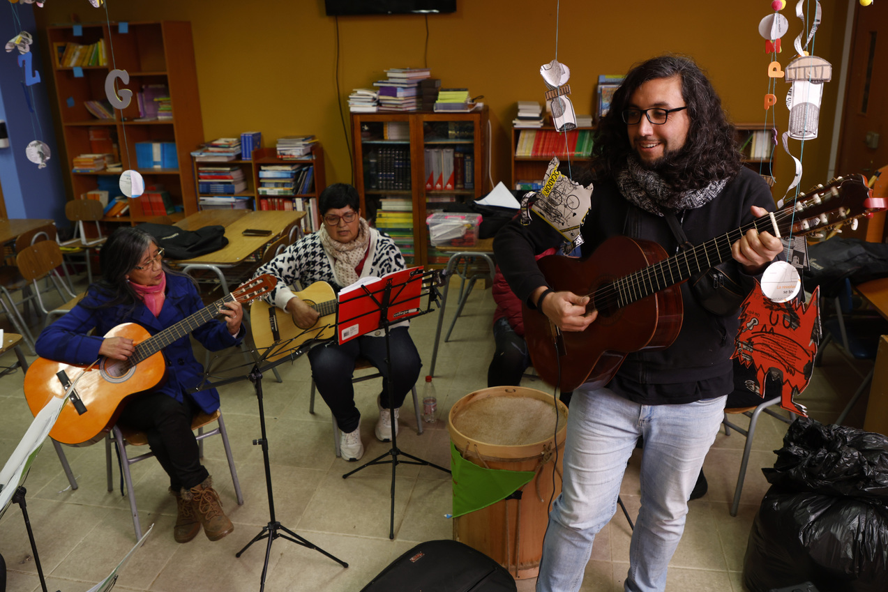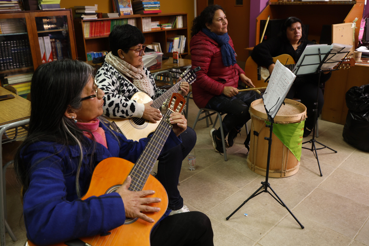 Esta organización realiza diferentes talleres y actividades gratuitas para la comunidad de Nueva Aurora, con la ayuda de profesores voluntarios. En este caso, ayudamos al taller “Cuerdas al Viento” (clases de guitarra), donde participan principalmente mujeres adultas mayores.