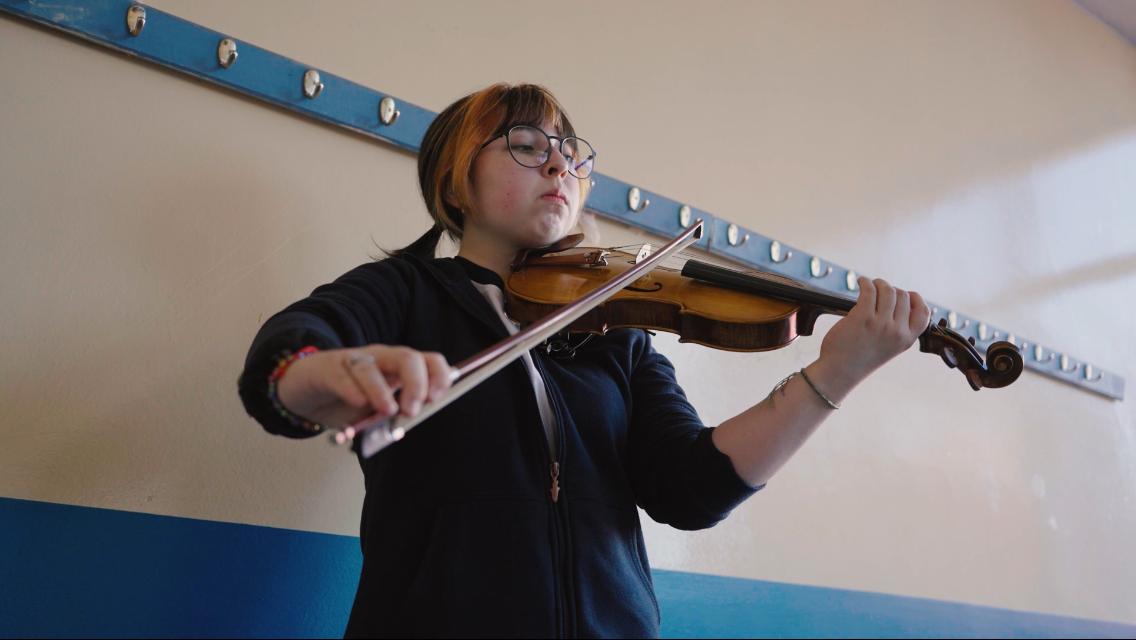 Sofía Gallardo tiene 14 años y desde los 5 estudia violín. La música ha sido la pasión de su vida y eso la llevó a sumarse a la Academia de Artes Islas Sur, ubicada en su ciudad de Castro, en Chiloé, donde integra la música de cámara y la orquesta sinfónica juvenil como concertino.